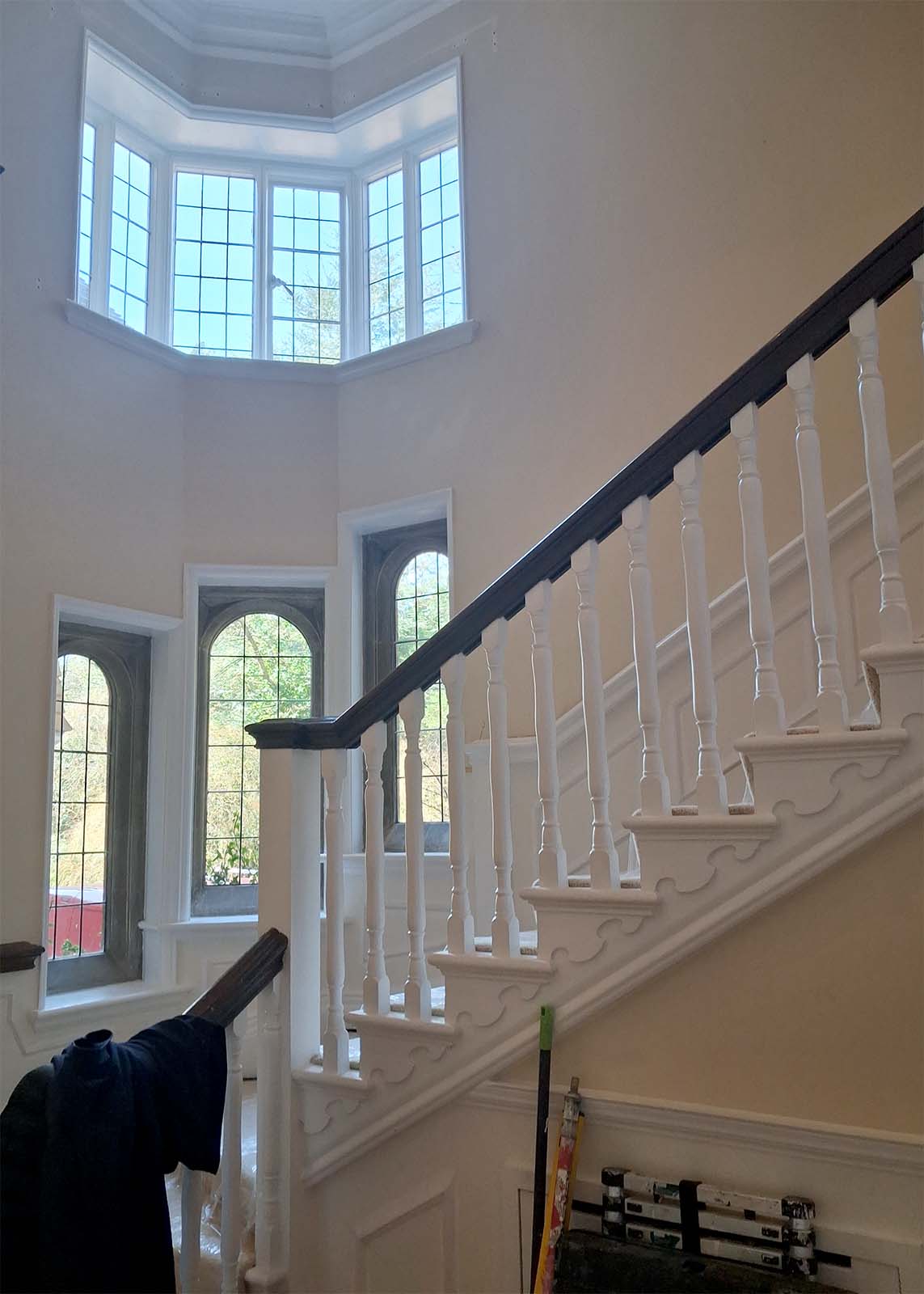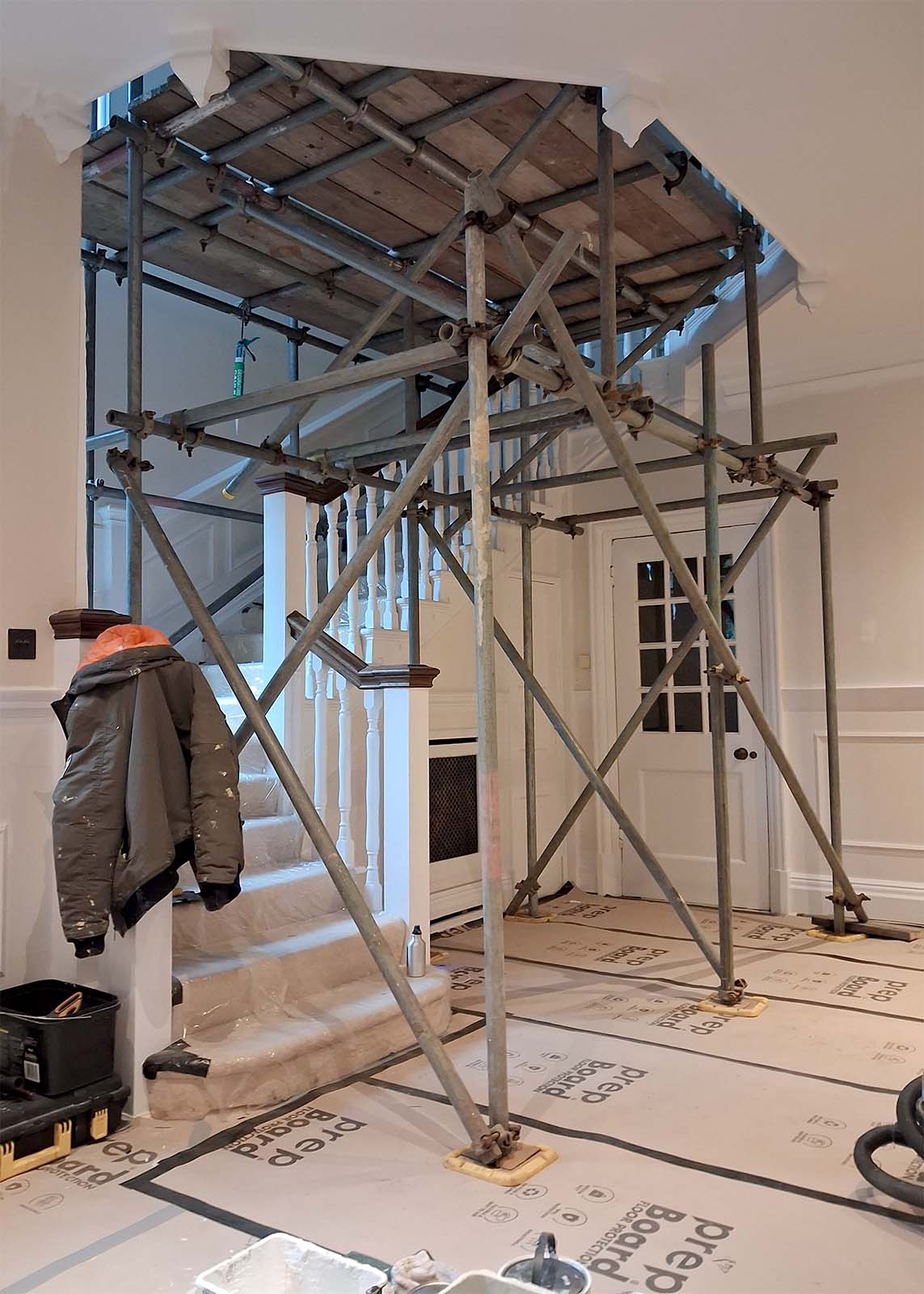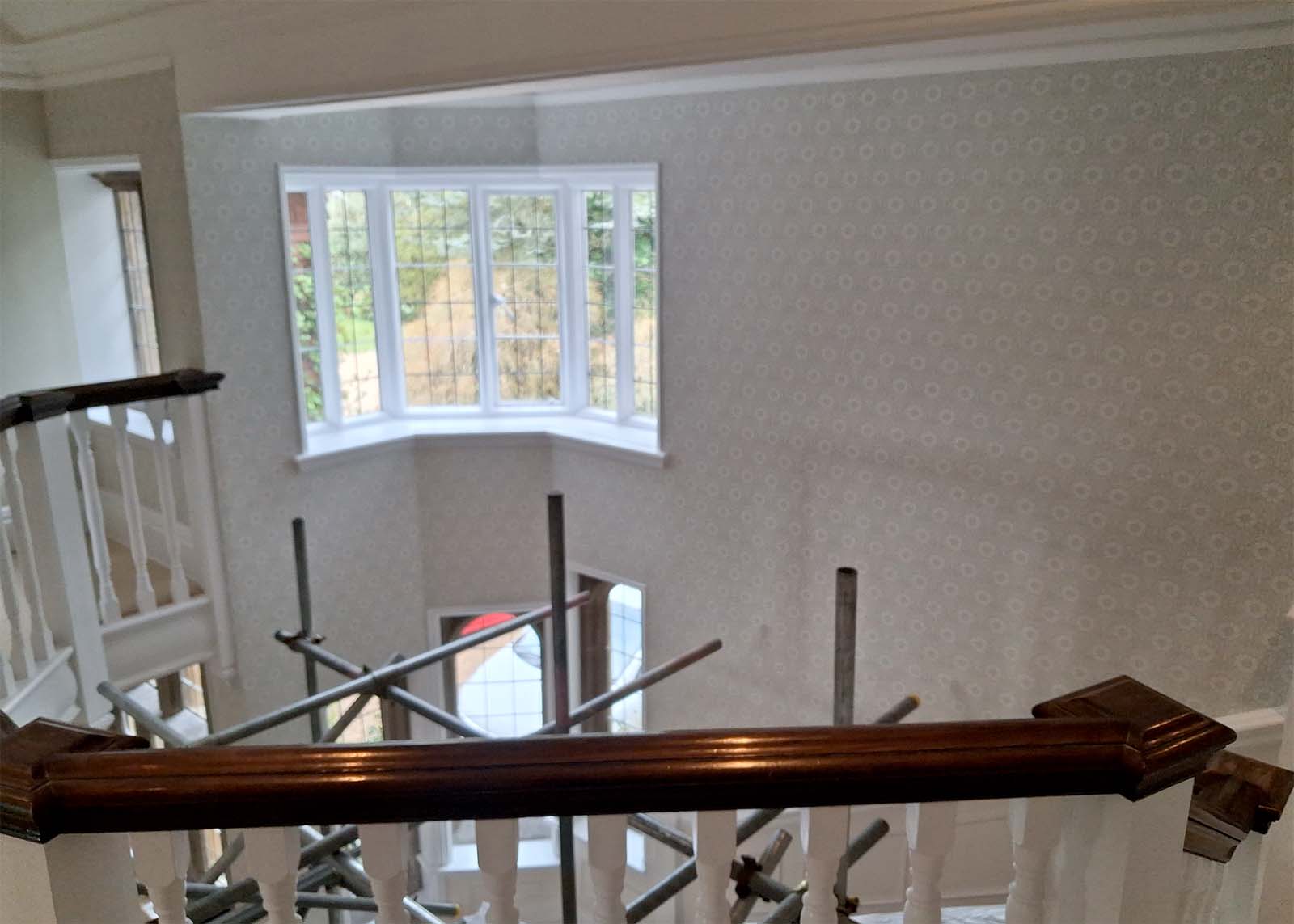 Scaffold was erected so that we could reach the ceiling and allow full access to staircase wall. The staircase wall was cross lined and then wallpaper was hung. The outer hall was also cross lined above the dado rail and new wallpaper hung.